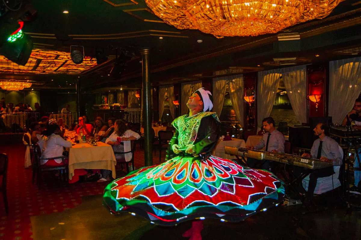 Indulge in a luxury dinner cruise Cairo experience featuring an all-you-can-eat buffet with a variety of hot and cold dishes, including fresh salads, rice, pasta, chicken, fish, and beef specialties. End your meal with delectable desserts and fresh fruits while listening to live Arabic music. As the night unfolds, watch enchanting belly dancing performances, and be mesmerized by the swirling Tanoura dancers performing traditional Sufi music – a magical element of Egyptian heritage.